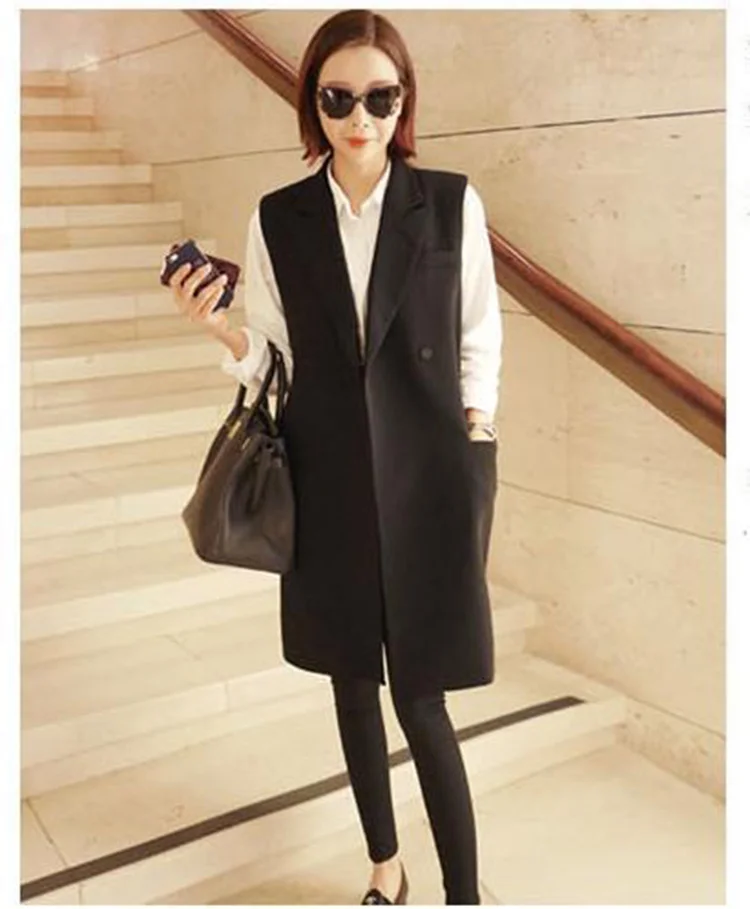 Оригинальный образ получится от комбинации длинного жилета с узкими штанами или лосинами и блузой на длинный рукав. В качестве аксессуара подойдет галстук, платок или шарф.