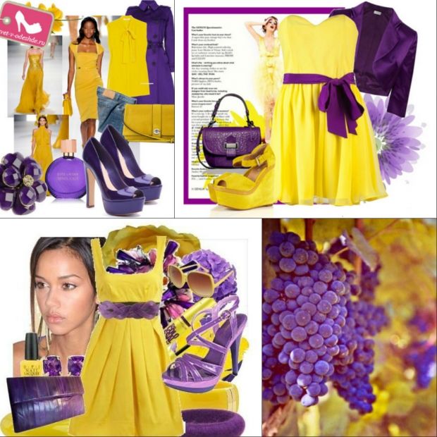 Если говорить об одежде, то в ходу абсолютно разные пропорции. К примеру, фиолетовое платье и желтая сумочка. На фото вы видите практически равноценное присутствие обоих цветов, но при этом по насыщенности один из них уступает, и это правильно.
