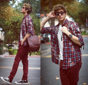 Красная рубашка в синюю клетку выглядеть эффектно. При создании стильного лука стоит грамотно подбирать аксессуары и элементы одежды.