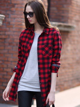 Клетчатую рубашку красного цвета можно носить как тунику – поверх юбки или брюк, дополненной ремешком. Длинные модели стоит комбинировать с леггинсами или джинсами. Смелые модницы любят сочетать длинную рубашку с короткой юбкой или шортами из денима.