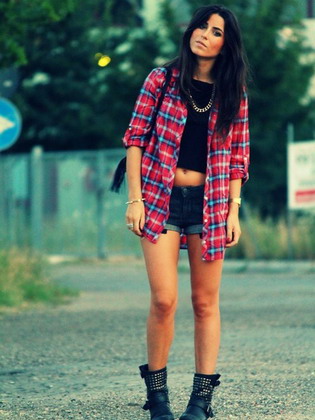 В теплое время года можно воспользоваться следующим луком: женская рубашка в клетку красная с черными или темно-серыми джинсовыми шортами. Отличным дополнением сюда послужат черные колготы и ботинки такого же цвета. При желании обувь можно заменить на белые кеды, а также добавить белую бельевую майку. Последний вариант выглядит более свежо, воздушно и молодежно.