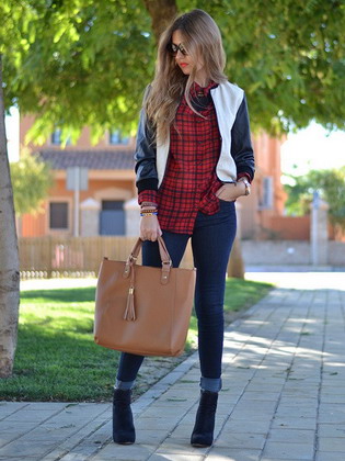 Для прохладной погоды прекрасно подойдет фланелевая рубашка в клетку, сочетающая в себе красный и синий цвета. Надеть такую вещь можно с джинсами синего цвета, а хорошо дополнит образ жакет синего цвета, совпадающий с тоном синих клеток на рубашке. Что касается обуви, можно использовать обычные лодочки телесного цвета или стильные черные ботильоны.