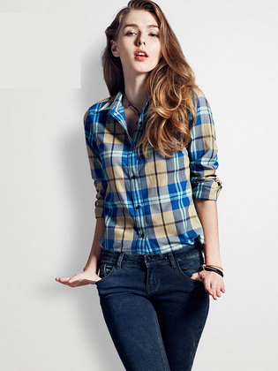 Приталенный крой рубашки будет так же хорошо смотреться на стройных девушках, выгодно подчеркивая достоинства фигуры. Данный фасон будет уместен абсолютно с каждым из выше представленных вариантов клетчатой расцветки.