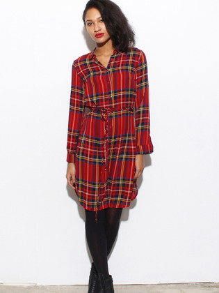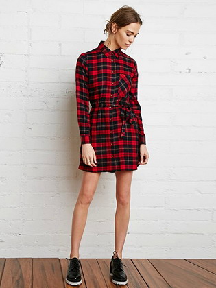 Красная удлиненная рубашка может быть использована в качестве своеобразного платья. В этом случае область талии украшают тонким пояском черного или коричневого цвета. На ноги же надеваются плотные черные колготы или чулки, а обувь предпочтительно выбирать на каблуке. Это очень смелый образ, поэтому не следует при его использовании злоупотреблять с макияжем и яркими аксессуарами.