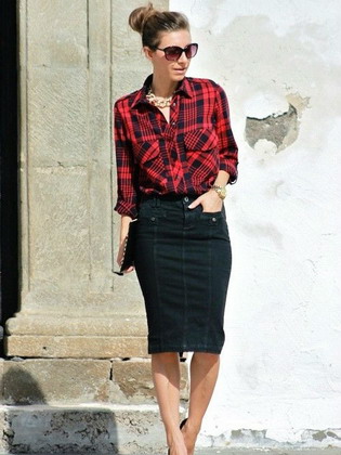 Черная или серая удлиненная юбка-карандаш является ответом на вопрос с чем носить красную рубашку в клетку. Это сочетание позволяет выглядеть крайне сдержанно, но при этом сохранять некоторую яркость и разбавлять пресный деловой стиль. Размер узора на рубашке следует подобрать более крупный. Важно помнить, что когда речь заходит об офисном или рабочем луке, то все пуговицы у рубашки должны быть застегнуты, это также позволит сохранить строгость силуэта. Хорошим завершением образа станут черные туфли на небольшом каблуке или босоножки на квадратном каблуке.
