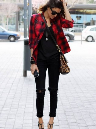 Рубашки в клетку с преобладанием красного цвета стоит комбинировать с одеждой чёрного цвета. Прекрасным решением станут джинсы чёрного цвета. Сочетание красного и чёрного – классика, поэтому часто встречаются рубашки, представленные в этих двух тонах.