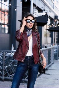 Бордовую кожаную жилетку можно сочетать с водолазкой и рваными джинсами. Этот оттенок фантастически смотрится с синим и черным. Но вы также можете поиграть с разными оттенками фиолетового и бордового.