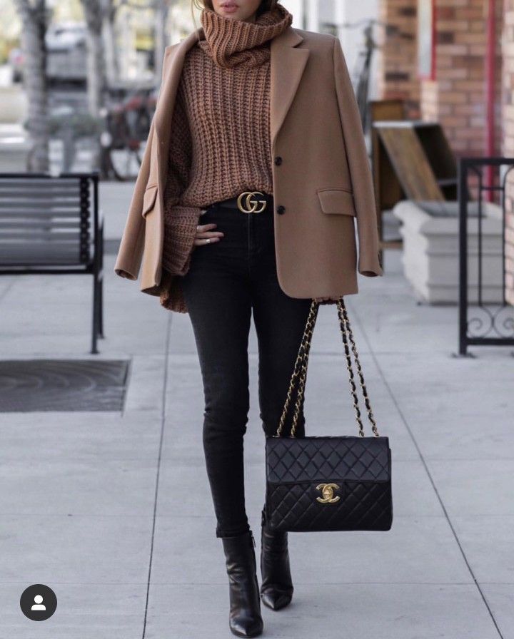 Эта великолепная женщина придает чудесный оттенок нейтрального телесного цвета своему полностью черному наряду. Удивительная идея для осени, так как нейтральные цвета лучше всего подходят для осени.