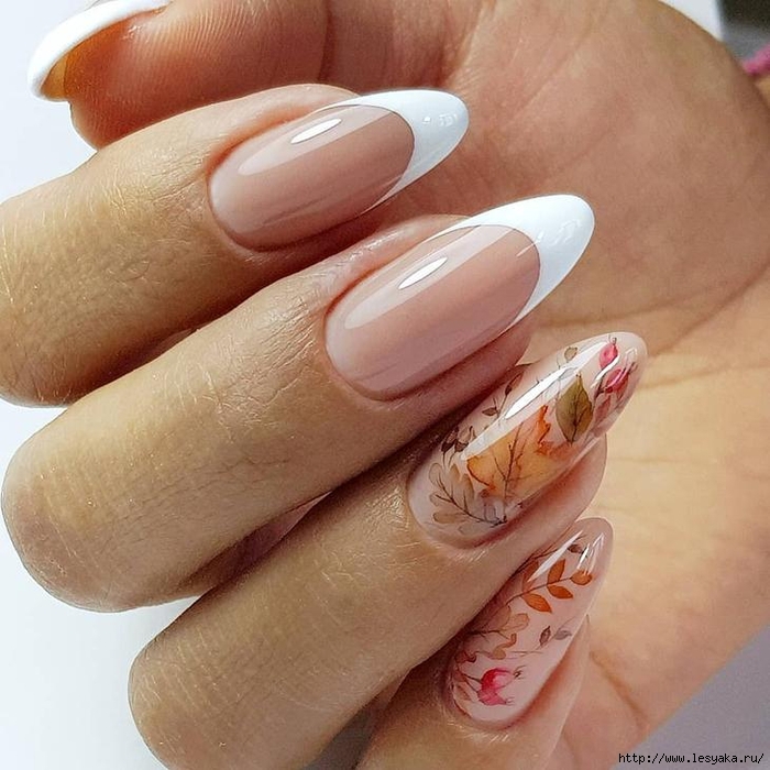 - Осенний френч-маникюр украшают сезонными рисунками, растительными и геометрическими узорами.