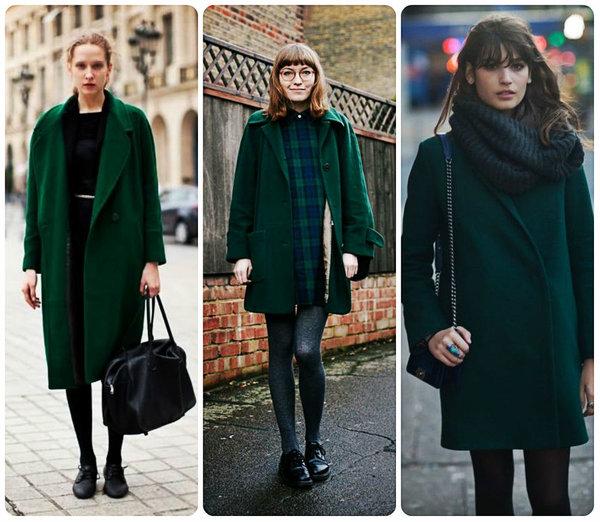 Приталенное или прямое пальто глубокого темно-зеленого цвета отлично сочетается с одеждой, выполненной в классическом стиле. Это может прямое платье или строгий брючный костюм. Темно-зеленый цвет великолепно смотрится на фоне одежды черного или темно-синего цвета.