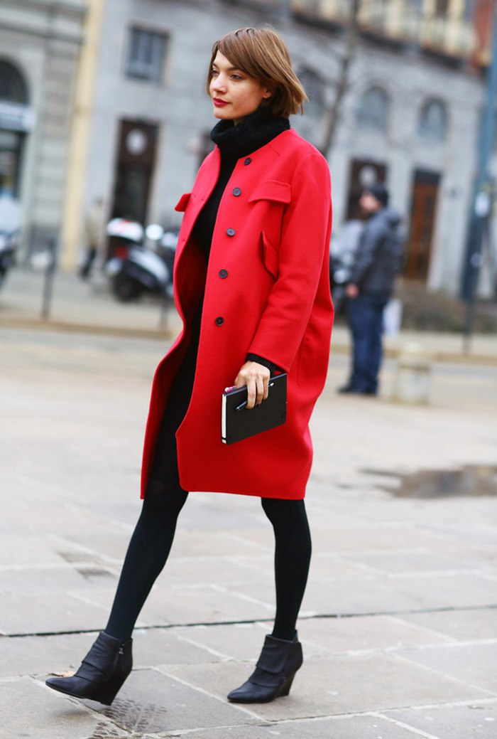 Классическим сочетанием станет красное пальто и узкие черные брюки или простое платье в стиле Коко Шанель. Вы будете выглядеть шикарно и изысканно.