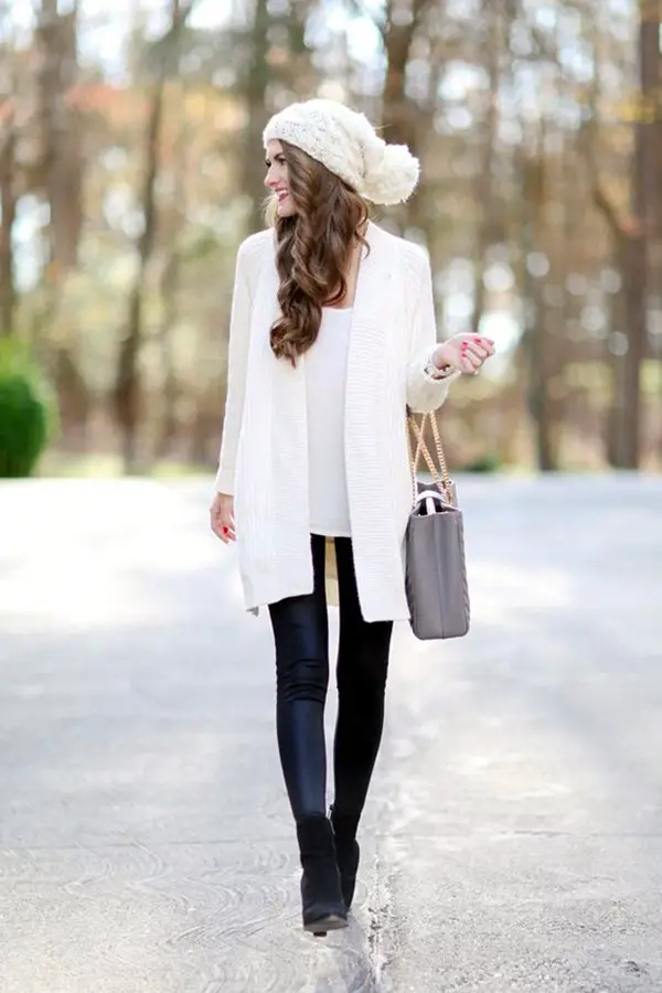 - Белый кардиган поверх рубашки с длинным рукавом отлично подойдет для выхода в свет, потому что в нем вы будете выглядеть собранно, не чувствуя себя слишком одетым или холодным зимой!