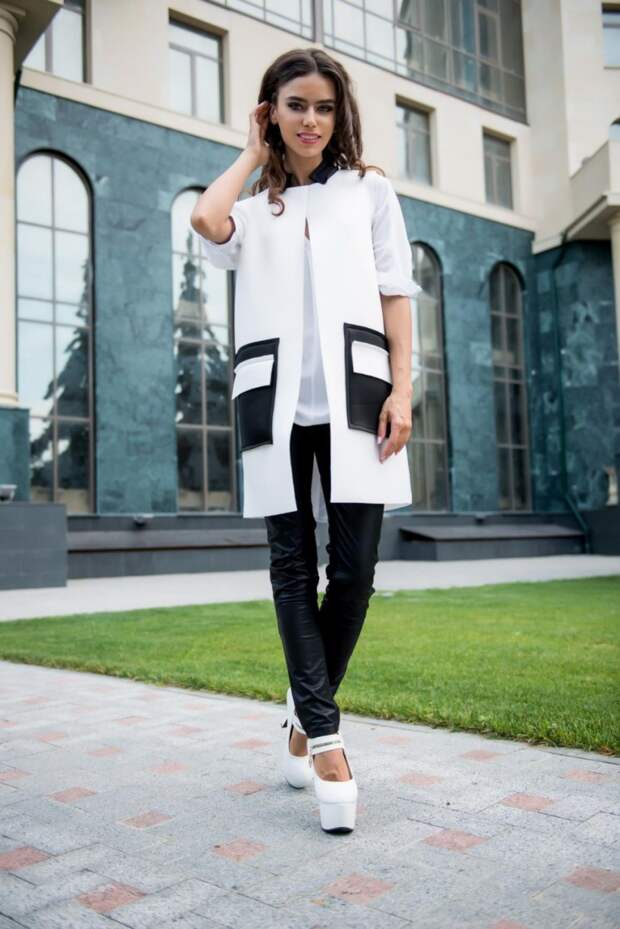 - Черно-белый шик. Выберем черное платье-футляр и белый удлиненный кардиган с асимметичным подолом. Дополняем образ черными лаковыми лодочками, узким ремешком из черной лаковой кожи и черным клатчем на длиной ручке-цепочке.