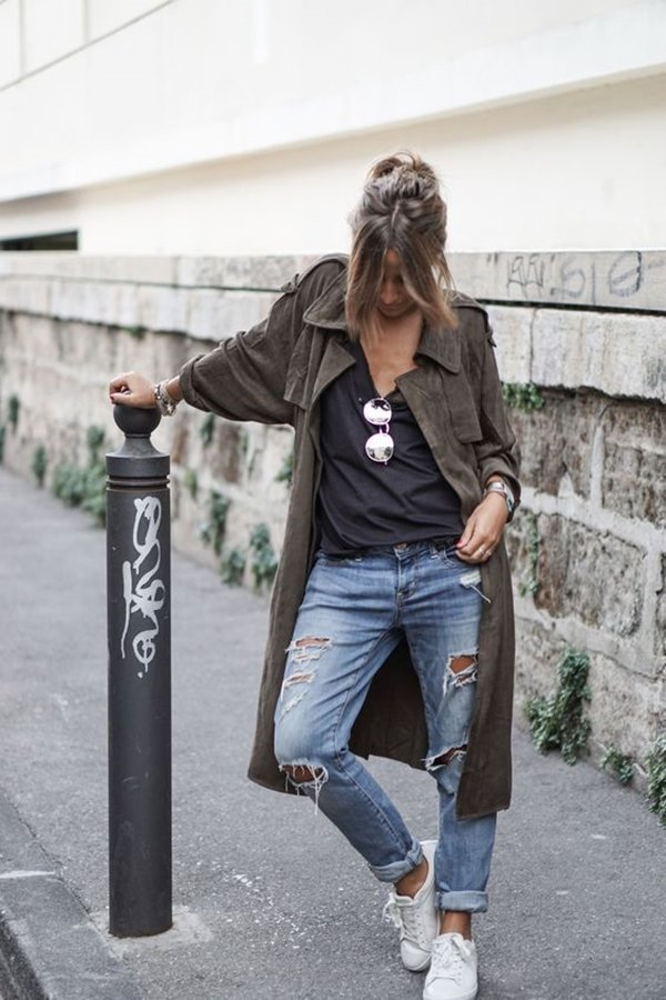 Задумались над проблемой подбора верхней одежды под джинсы-бойфренды? Есть идея! Доводим длину пальто до максимума: тяжеловесное пальто-халат или кокон с объемной линией плеч идеально подойдут для повседневного лука на основе бойфрендов. А если холода еще не так сильно дают о себе знать, тогда классический английский тренч цвета кэмэл не только защитит от дождя и ветра, но и дополнит образ. Даже если речь идет о хулиганских рваных джинсах.