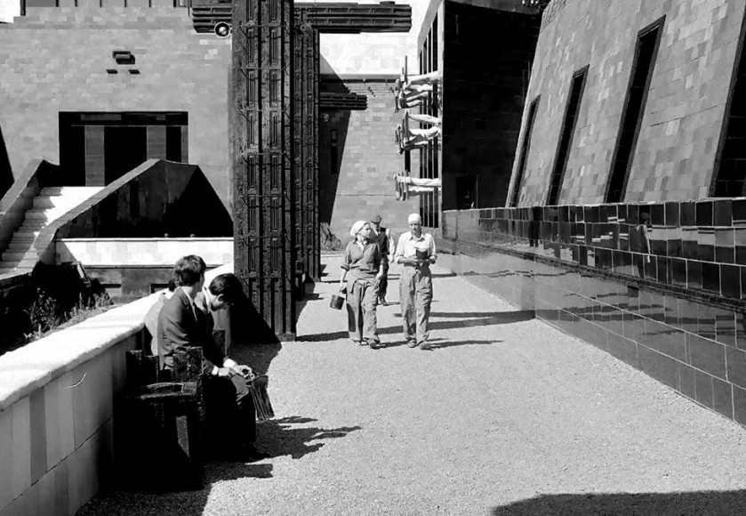 Декорация размером примерно с два футбольных поля окружена пятиэтажным фантазийным зданием с гнетущей архитектурой. К одному зданию, одурманенному варианту могилы Ленина, ведет неправильный зиккурат. Стадион, похожий на Колизей, возвышается над двумя унылыми жилыми домами. Атональная виолончельная музыка разносится по городу из установленных на столбах громкоговорителей. Единственная цель этого, кажется, состоит в том, чтобы сделать человека напряженным, неудобным, на грани.