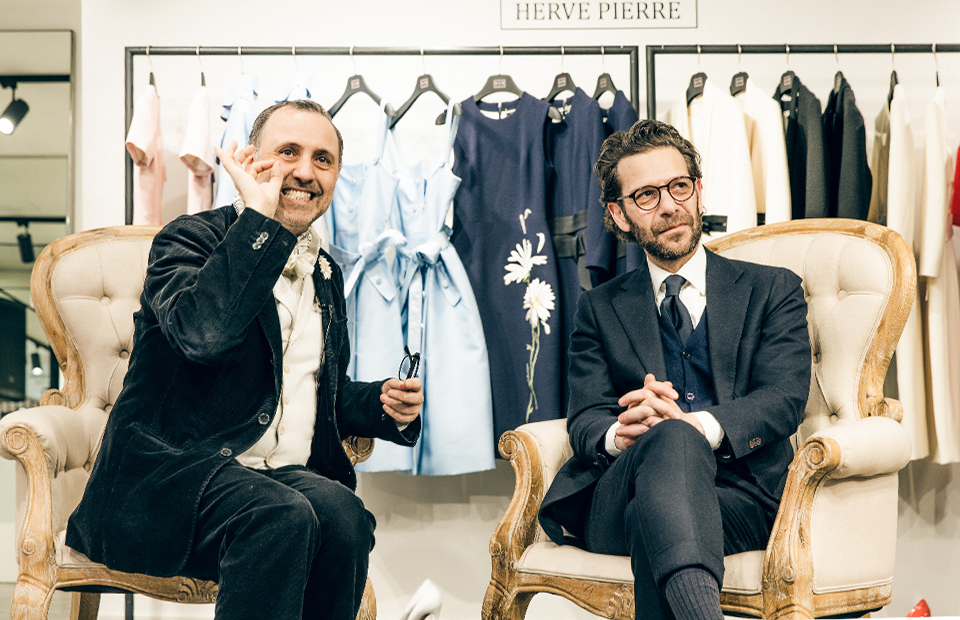 Эрве отвечает в Atelier Caito for Herve Pierre за дизайн платьев и контакт с клиентками. На лацкане у него белая с желтым маргаритка, на шее – платок Hermès. Без них он с юности не выходит из дома, школа общения со снобами кутюра научила его не снимая носить свои собственные знаки отличия.