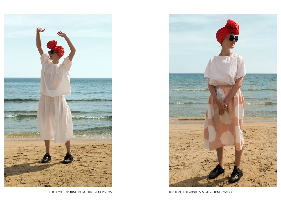 ДНК бренда Nina Donis хорошо прослеживается и в новой весенне-летней коллекции. Для вдохновения на рабочий мудборд дизайнеры прикрепили изображения безоблачного голубого неба и пустых пляжей с разноцветными зонтиками, образы мексиканской художницы Фриды Кало и американского актера Роберта Де Ниро из фильма «Таксист», фотографии русских национальных костюмов и полосатых ретрокупальников.