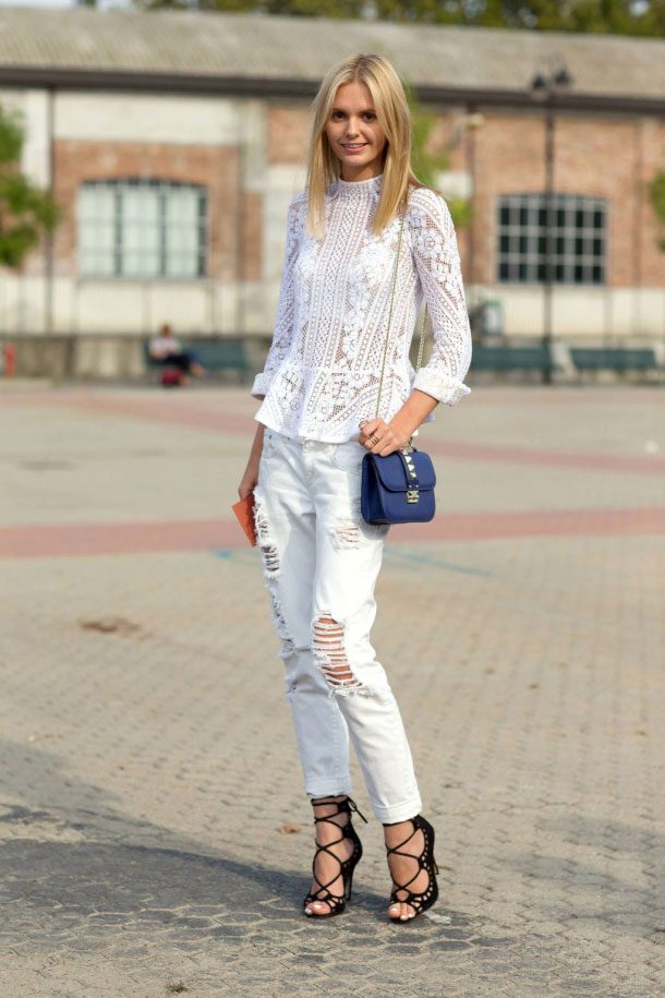 Также имейте в виду: чем темнее джинсы, тем элегантнее выглядит образ. Популярными будут белые блузки в винтажном стиле.