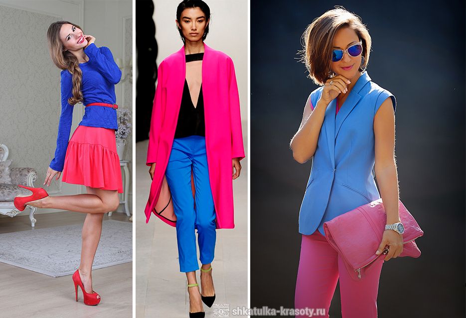Важно комбинировать оттенки: подбирать к малиновому тону синие джинсы, к пурпурному платью – зеленый или желтый жакет и т.д.