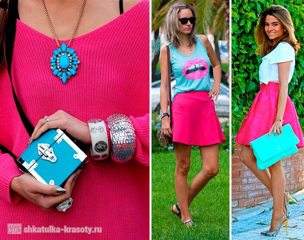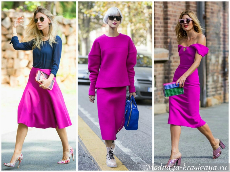 В повседневности выбирают тусклые оттенки фуксии. Если всё же хочется побаловать себя сочными, их нужно дополнить аксессуарами прочей расцветки, которые помогут оттенить броскую дерзость.
