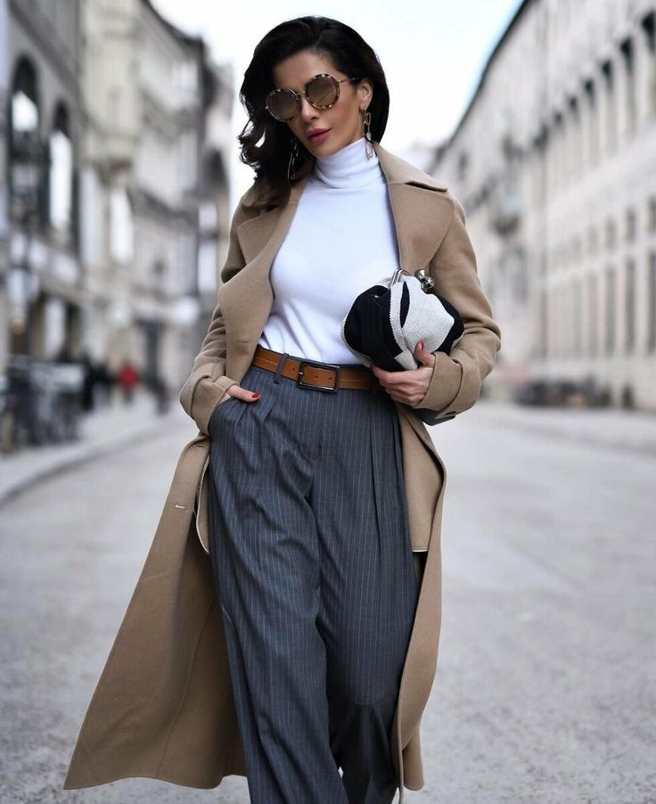 Он состоит из костюмных брюк и кашемирового пуловера, которые являются неотъемлемой частью гардероба. Для дополнительного гламура добавьте шерстяное пальто.