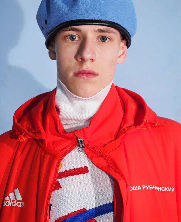 Не поскупился дизайнер и и на сотрудничество с adidas, с которым Рубчинский работает над созданием линейки спортивной одежды, приуроченной к Чемпионату мира по футболу в России. К слову, о своих крепких намерениях по поводу тесной дружбы с брендом может свидетельствовать выбритый на голове одного из моделей логотип adidas. Смело!