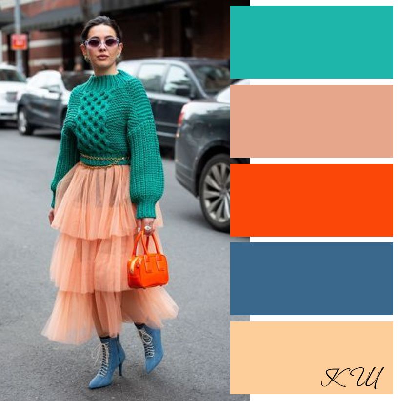 Он сделает образ более гармоничным, уравновесит яркий оранжевый. Для предпочитающих неоновый оранжевый цвет лучшим вариантом будет употребить его в аксессуарах, строго дозировано.