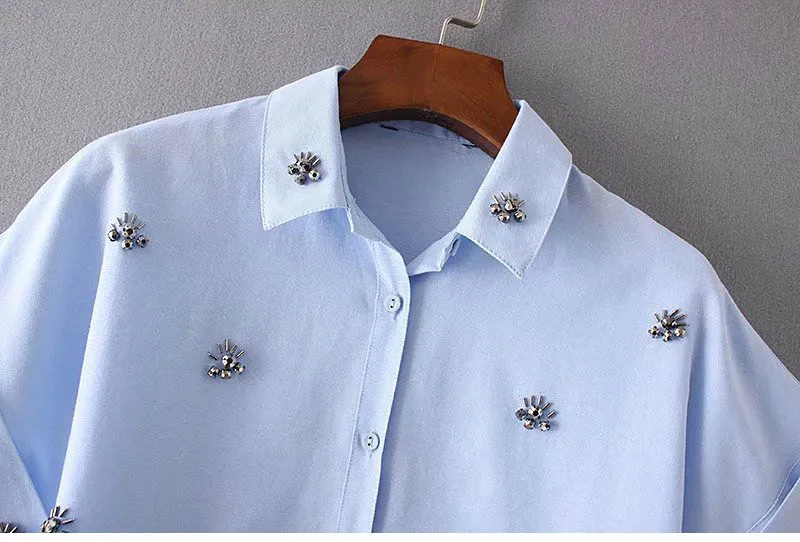 Украшение искусственными камнями пожалуй самое интересное решение в плане украшения блузки. Словно в сказке, как жар горят, на солнце переливаются разноцветные камешки и обычная однотонная вещь выглядит сразу нарядной. Вырез горловины округлой формы легко усыпать мелкими камешками. Для отложного воротника необходимо продумать рисунок, какую-то геометрию. В конце статьи собраны фото, как украсить воротник блузки рубашечного покроя.