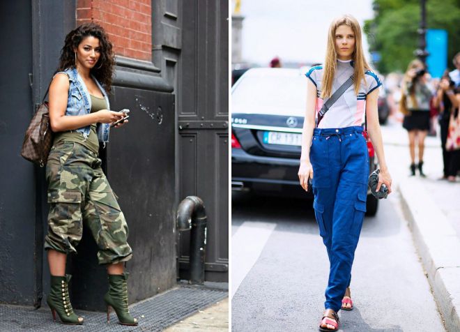 Данная вариация штанов в армейском стиле прекрасно подойдет для мероприятий, на которых необходимо много и активно двигаться. На пике моды в настоящий момент штаны с низкой посадкой. Их длина доходит до стопы. Именно это дает возможность сочетать данный предмет одежды с любой обувью.