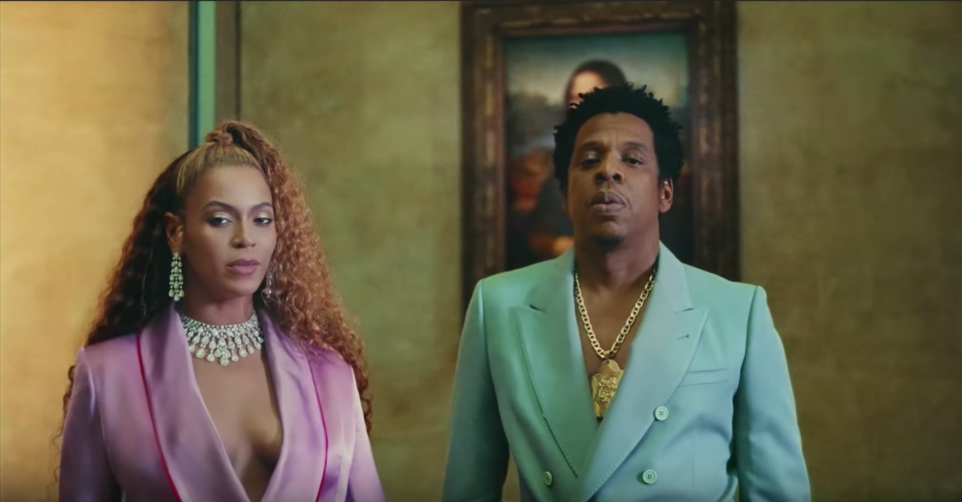 Когда зрители впервые встречают Картеров в Лувре, пара стоит перед Моной Лизой Леонардо да Винчи в сочетающихся друг с другом пастельных костюмах.