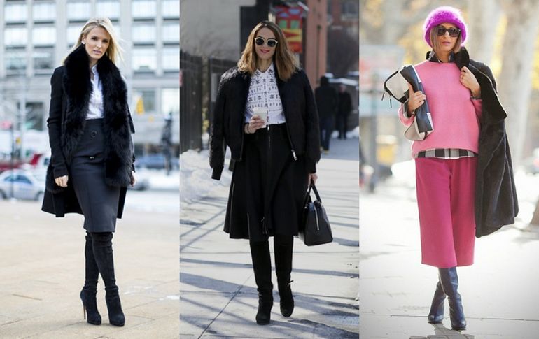 С юбками длиной до колен, встык с ними или пряча ботфорты под ними (так еще и теплее!).