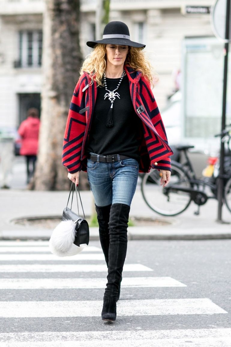 В этом сочетании нет ничего критичного, но выглядит оно уже очень старомодно и скучно. Тандем джинсов и ботфортов очень простит и удешевляет образ.