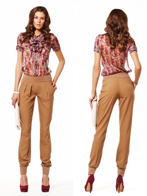 - отличная задумка на каждый день для жаркого лета – полуприлегающий темный или светлый топ и коричневые брюки в насыщенных тонах, либо замечательный нарядный образ в стиле французского шика: разноцветный блузон, желательно с хищным принтом и широкие летящие штаны.