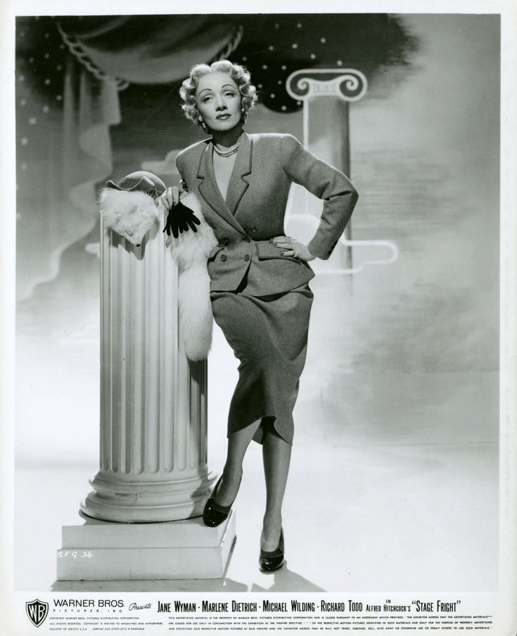 Дитрих иногда носила свои личные украшения в своих ролях. Здесь, в фильме Альфреда Хичкока « Страх сцены 9».