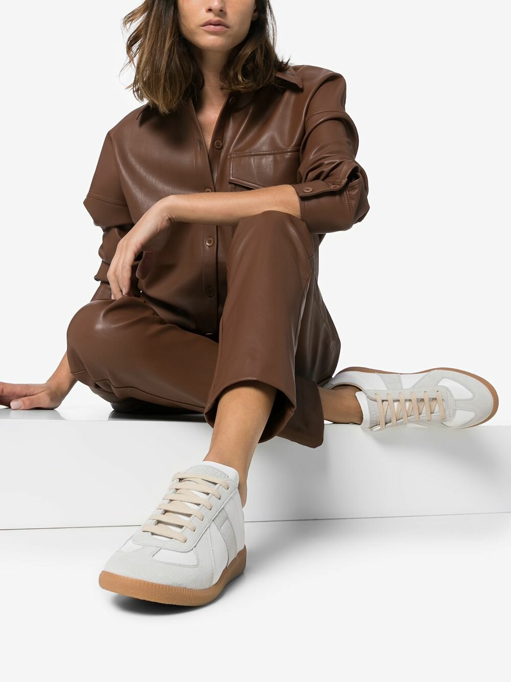 Replica — это капсульная коллекция мужской и женской линий Margiela, которая включает около 30 предметов основной одежды и аксессуаров, выпускаемых сезонно. В коллекции Replica остаются некоторые из самых популярных моделей Margiela, такие как German Army Trainer (часто сокращенно GAT). В последние годы ботинки Tabi от Margiela, вдохновленные дизайном традиционных японских носков с тем же названием, с разрезным носком, стали культовыми.В то время как бренд Margiela работает без человека, который все это начал, дизайн остается актуальным, как никогда.
