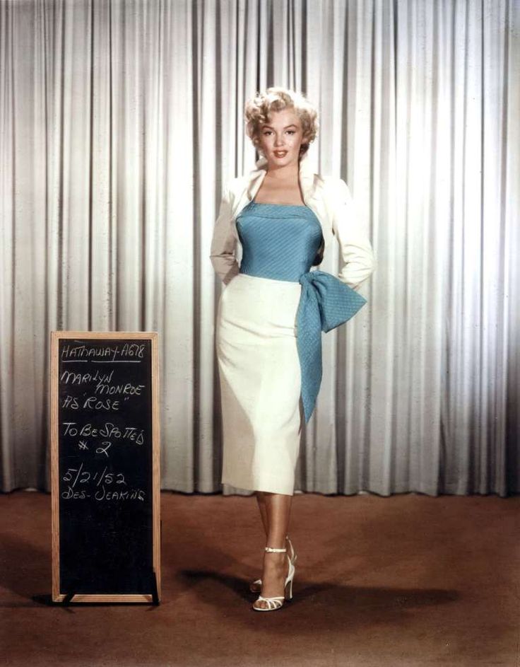 Самые, пожалуй, хрестоматийные наряды Мэрилин — платье-корсаж оттенка фуксии из фильма «Джентльмены предпочитают блондинок» и белое платье с юбкой, которую подхватывает и задирает сквозняк из вентиляции метро в фильме «Зуд седьмого года» — работы Уильяма Травиллы. А костюмы для «Ниагары» делала Дороти Дженкинс, художница по костюмам, лауреат трёх «Оскаров». Кстати, она не была сотрудницей какой-либо студии, а делала карьеру фрилансера, что было довольно необычно в те времена. Она создала для Мэрилин безупречно сидящие юбки-карандаш и жакеты-болеро, которые тут же растиражировали все крупные универмаги США.