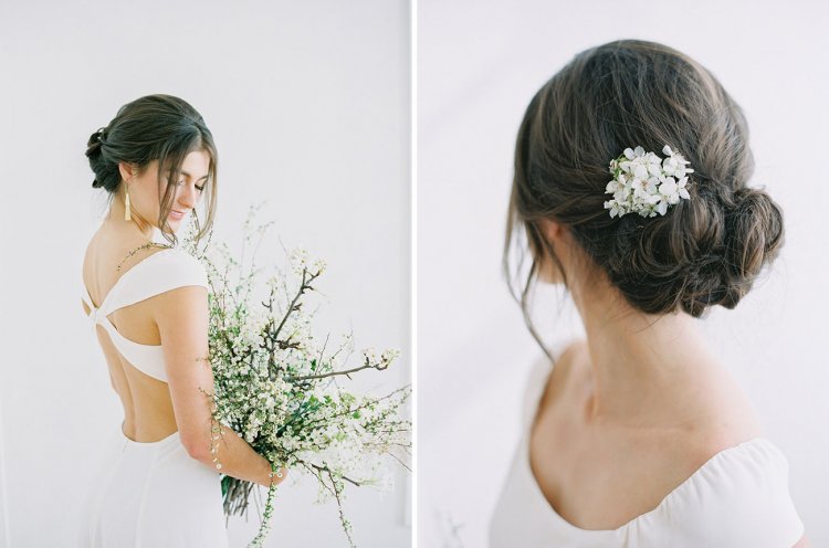 Стиль минимализм требует особого внимания при выборе аксессуаров. Прическу невесты может украшать небольшая вуаль или дизайнерская заколка, также в качестве украшения допускается использовать живой цветок.