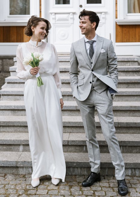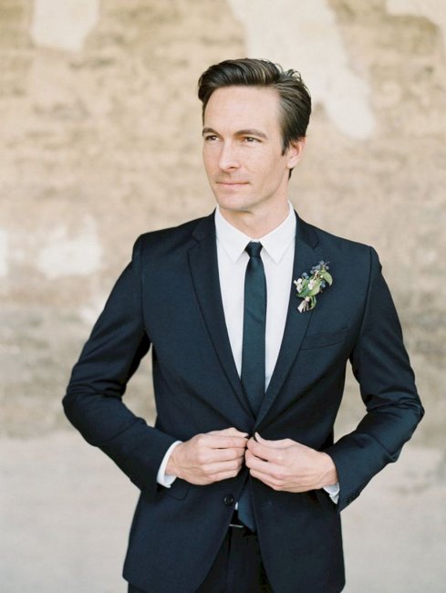 Минималистичная свадьба требует элегантного образа не только от невесты, но и от жениха. Лучше остановиться на классическом костюме в черном, синем или сером цвете, избегая необычной отделки, больших пуговиц и застежек.