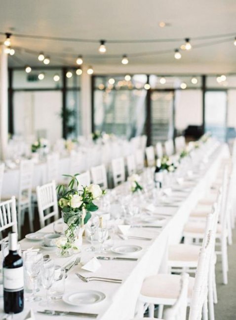 «Чем меньше, тем лучше» — вот основа минималистичного декора. Откажитесь от чехлов на стульях, не используйте скатерти и объемные флористические композиции на столах гостей, заменив их лаконичной дорожкой из зеленых веточек – это визуально сделает пространство более открытым, наполнит его воздухом.