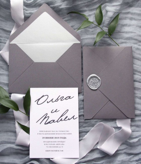 Пригласительные открытки также должны отображать стиль свадьбы. Они могут быть написаны простым шрифтом на белой бумаге. Исключаются завитушки и разноцветные украшения.