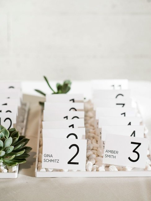 Не забудьте и о полиграфии: схема рассадки или рассадочные карточки в черно-белых тонах с изысканной каллиграфией будут смотреться на минималистичной свадьбе очень органично.