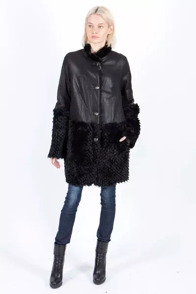 Длинная кожаная короткая дубленка с полностью черной одеждой