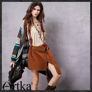 Юбки в этно-стиле обычно имеют прямой, трапециевидный крой или крой солнце-клеш. Очень популярны длинные юбки с принтом в африканском или цыганском стиле. Такая юбка может отлично сочетаться с белым или черным топом, босоножками на плоской подошве и небольшой сумочкой с бахромой через плечо.