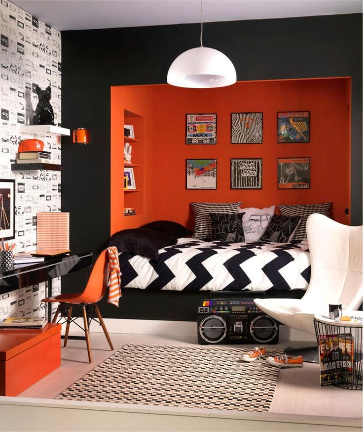 Хорошим вариантом станет комната, в которой обои, краска на стенах имеет бежевый цвет, а мебель или текстиль – апельсиновый.