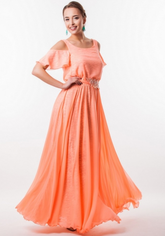 Персиковое платье в пол с открытым декольте и украшение на поясе