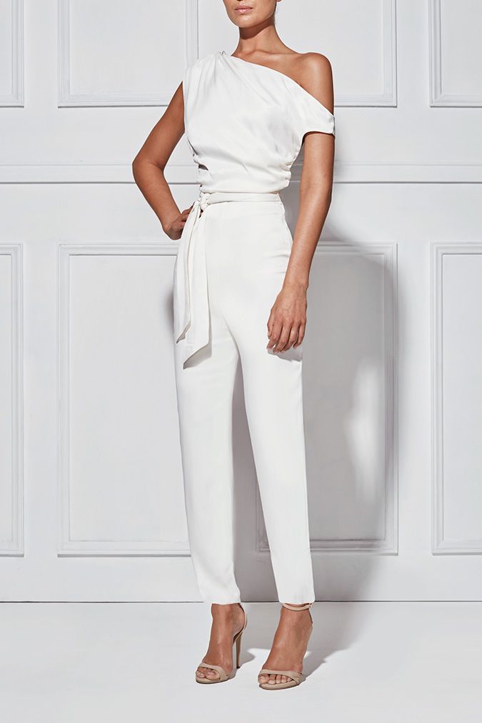 Гладкий черный пиджак в паре с белым асимметричным белым платьем-миди дополнен черными брюками до щиколотки. Также можно добавить холодные оттенки и классические черные туфли-лодочки:
