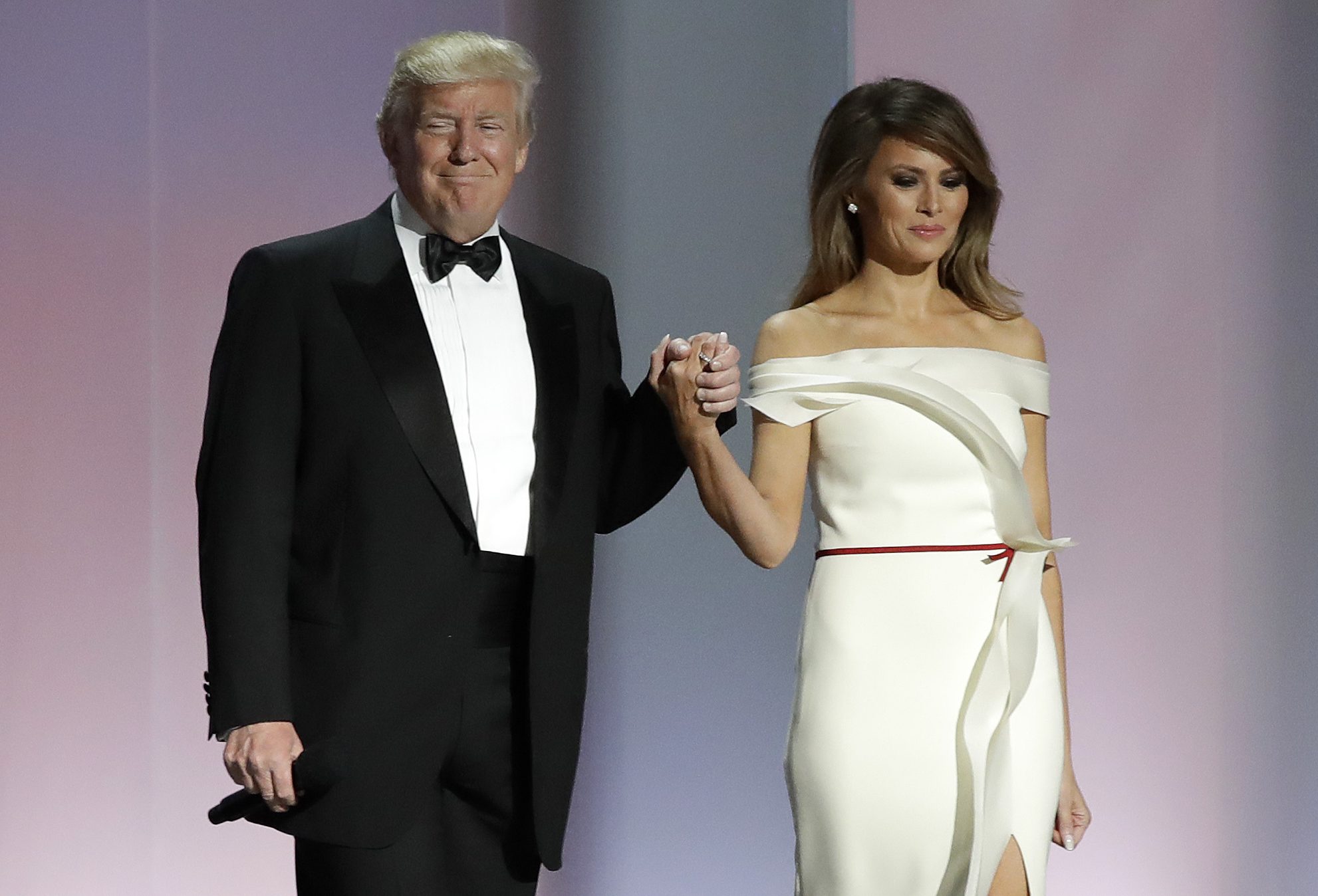 На фотографии изображена пара, улыбающаяся в одинаковых образах на красной ковровой дорожке. Г-н Трамп носит традиционный галстук-бабочку, а первая леди надела свои фирменные туфли на шпильке.