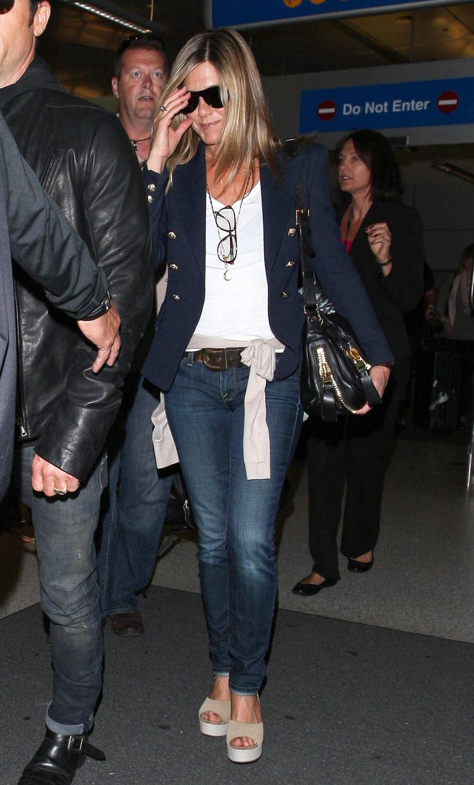 Если вы думали, что о ее повседневном стиле и красной ковровой дорожке стоит поговорить, подумайте еще раз. Наряды Дженнифер Энистон в аэропорту — это отдельный класс. Они представляют собой простой непринужденный шик, как и обычный стиль Дженнифер Энистон. Но они также имеют комфортный уровень, который требуется при путешествии по воздуху. Простая белая футболка с джинсами и уютной курткой — отличный наряд.