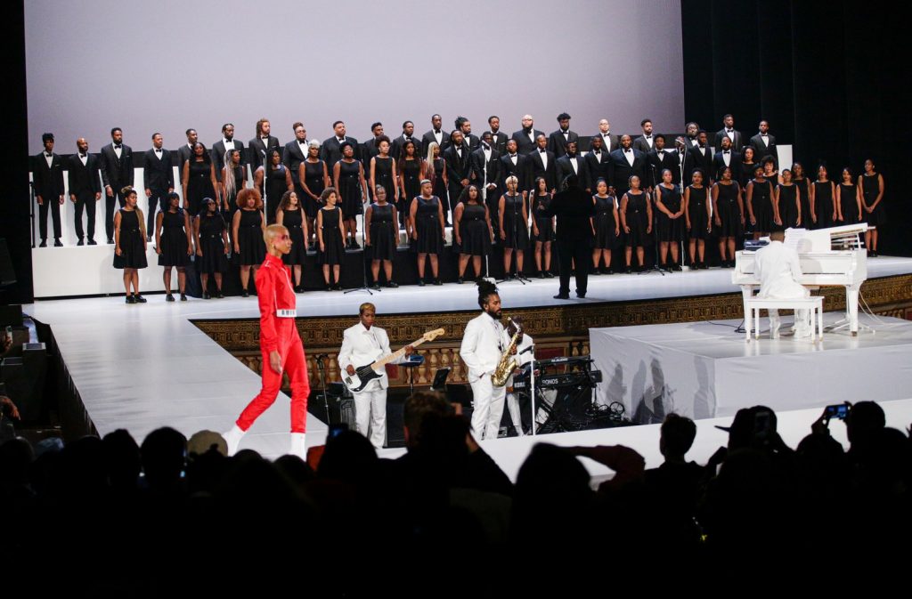 Демонстрация новой коллекции сопровождалась живым выступлением Жанель Монэ, которая специально подготовила сетлист из классических джазовых композиций.