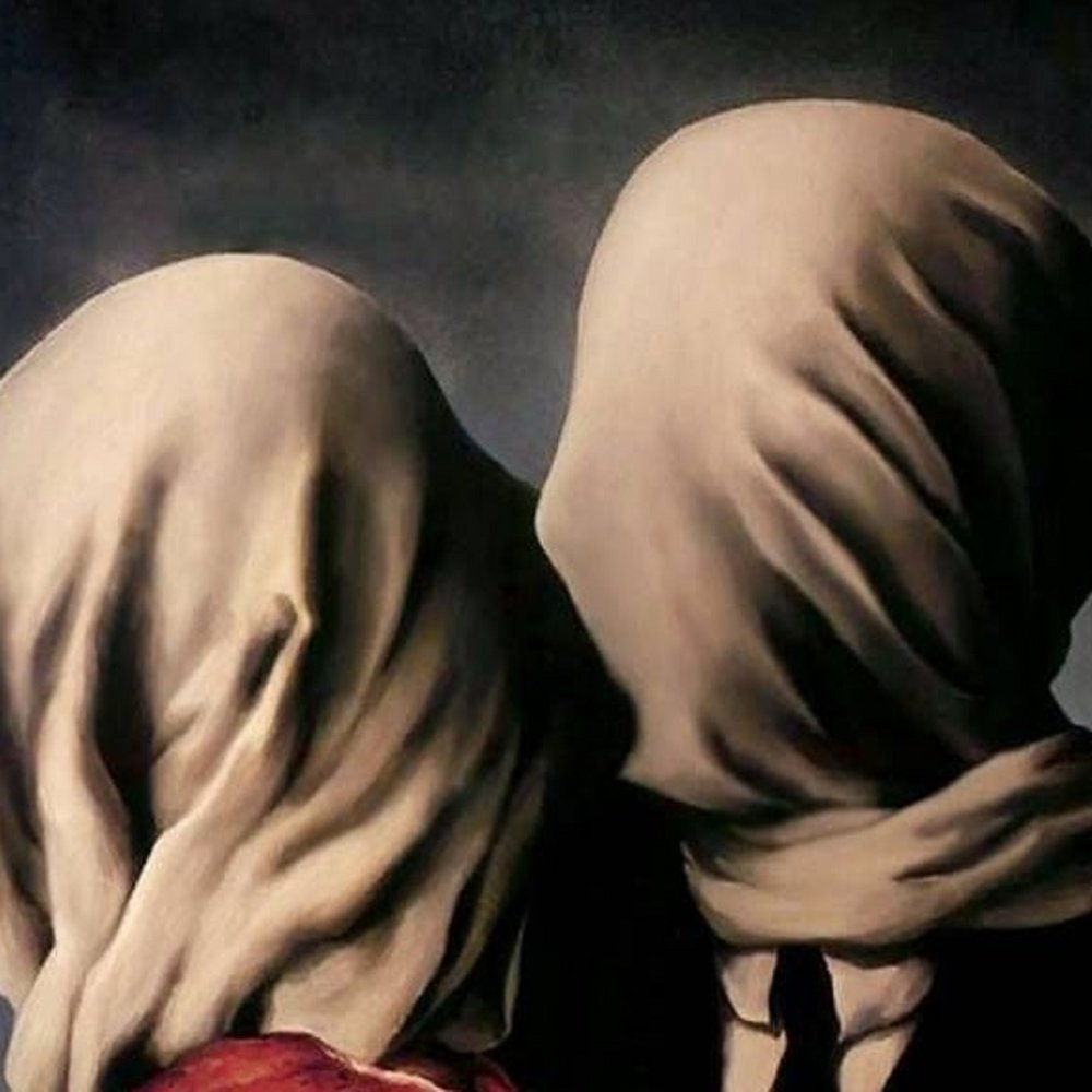 Начать можно с того, что картина эта существует в двух вариантах. Оба они изображают мужчину и женщину, чьи головы скрыты под белой тканью. На одной версии картины они целуются, не снимая этих странных покровов, на другой же — как будто смотрят на зрителя (если, конечно, сквозь эту ткань можно смотреть).